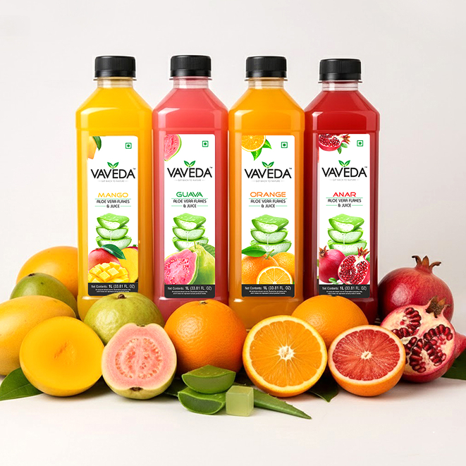 Vaveda brings you a refreshing range of fruit juices blended with real aloe vera flakes. Each bottle is crafted to deliver natural hydration, delicious taste, and wellness in every sip. We carefully select fresh fruits and pure aloe to ensure every drink is packed with natural goodness.